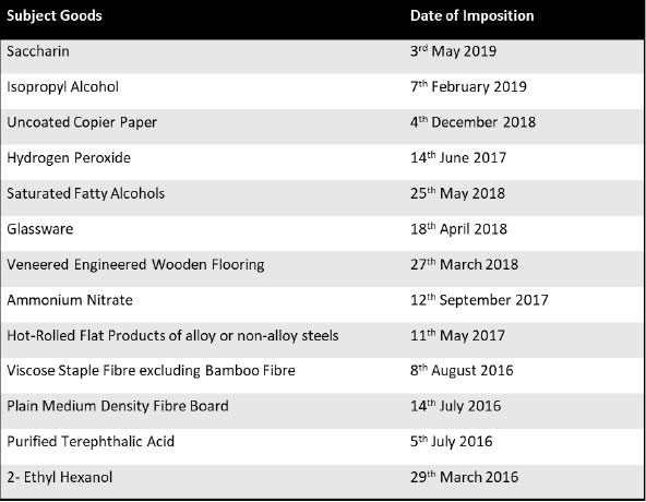 India ranks as the most frequent initiator and imposer of safeguard measures. Indonesian manufacturers have encountered many dumping and safeguard measures from India. In May 2019, The Indian Finance Ministry imposed definitive anti-dumping duty on Saccharin Imports from Indonesia. Other Indonesian products have also been impacted by Indian trade remedy actions such as Poly Vinyl Chloride (PVC) Suspension Grade, Float Glass, Maleic Anhydride MAN, 2-Ethyl Hexanol, Partially Oriented Yarn (POY) and many other items.