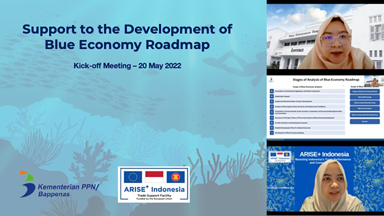 Following the formulation of the Blue Economy Framework, Bappenas initiated the development of the Blue Economy Roadmap, where ARISE+ Indonesia contributes to supporting the analysis process. A kick-off meeting was held on Thursday (20/05) to discuss the scope of work and timeline. A Policy Planner at the Directorate of Trade, Investment and International Economic Cooperation, Bappenas, Deasy Pane, led the discussion.