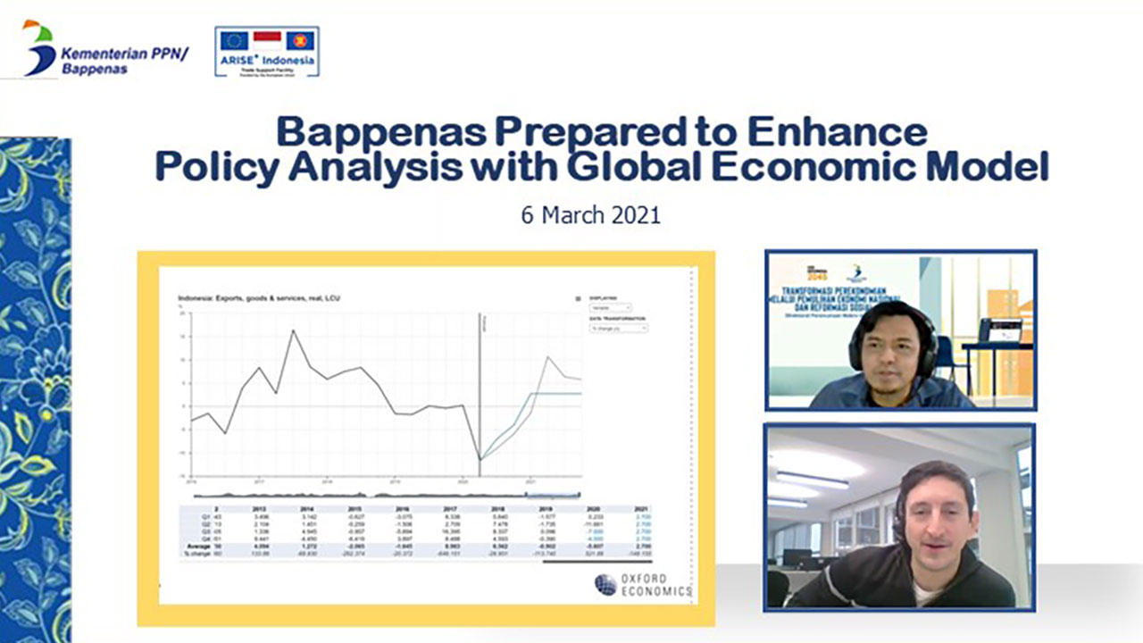 In collaboration with Oxford Economics, ARISE+ Indonesia facilitated a training session for Bappenas on updating the Global Economic Model (GEM). This model provides Bappenas with the capability to conduct simulations on different policy scenarios and assess their short, medium and long term impact.