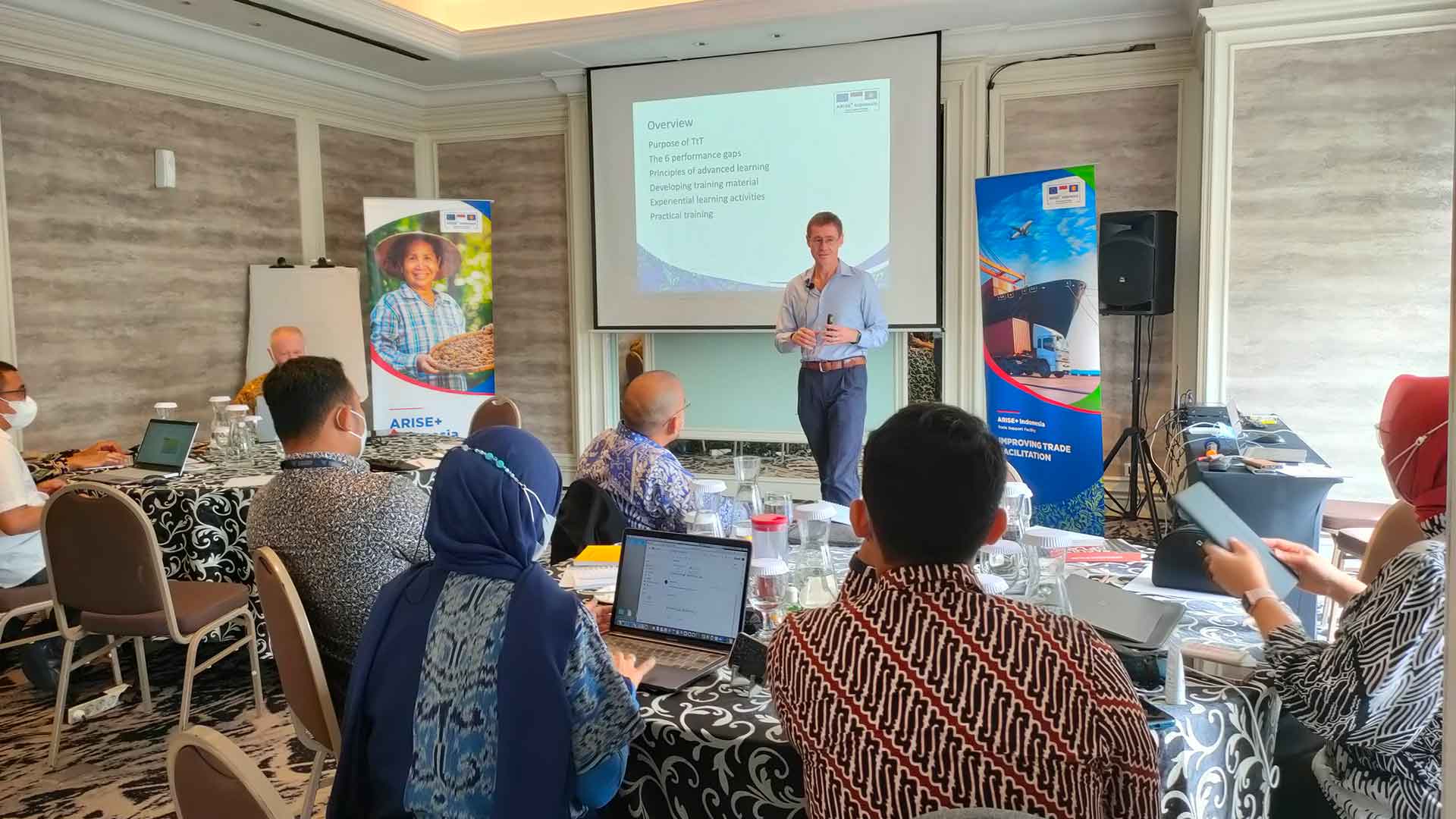 During the three-day training, ARISE+ Indonesia International Trade Law Expert Dr Gustav Brink trained the participants to master their skills in delivering the engaging capacity-building session. The trainees learned to address the six performance gaps: knowledge, skills, mindset, motivation, communication and environment, and took a turn to practice in front of the class.