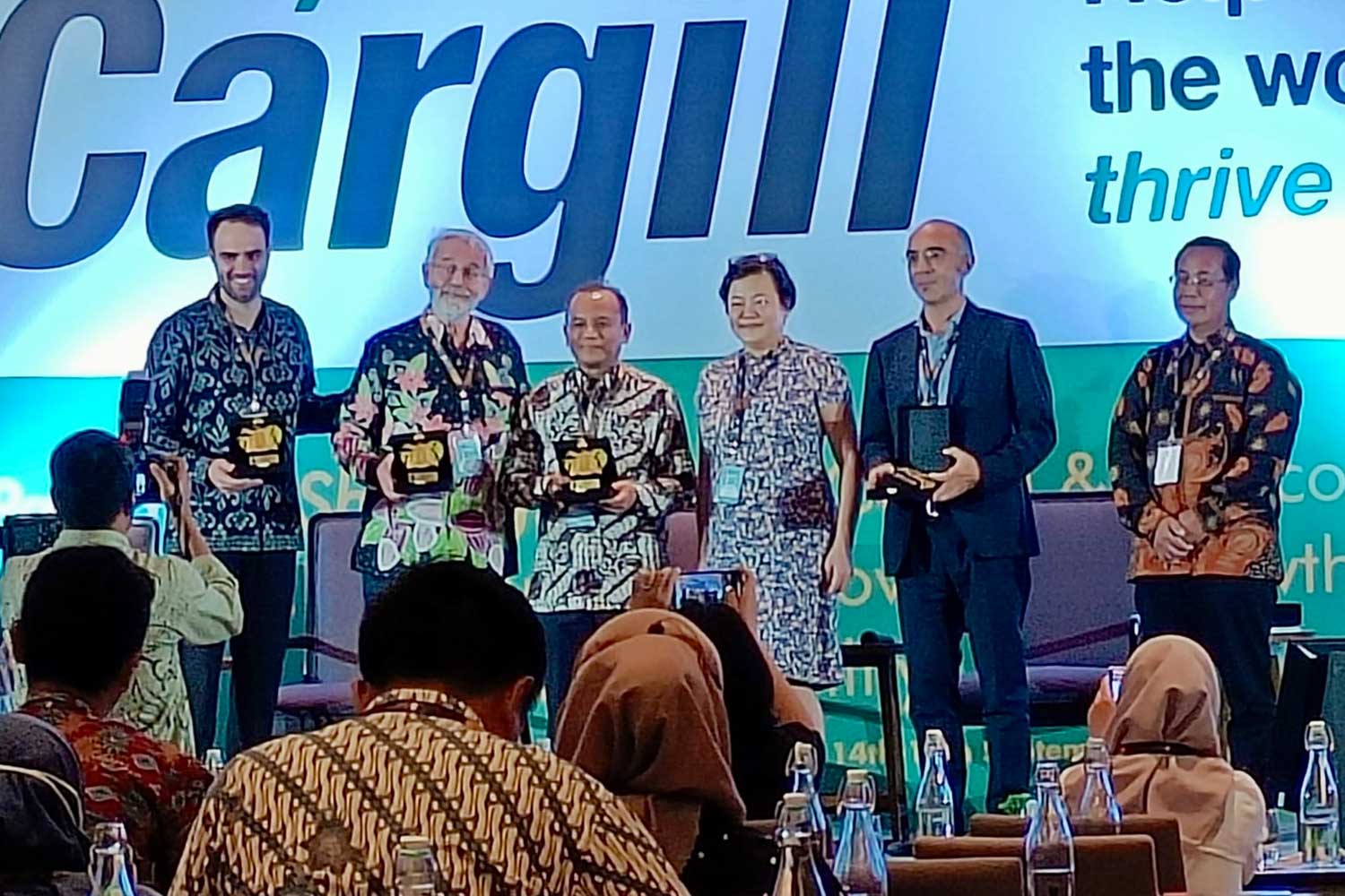 ^ Giovanni Galanti (second from the right) receiving a token of appreciation at the 8th Indonesian International Cocoa Conference and Dinner 2023