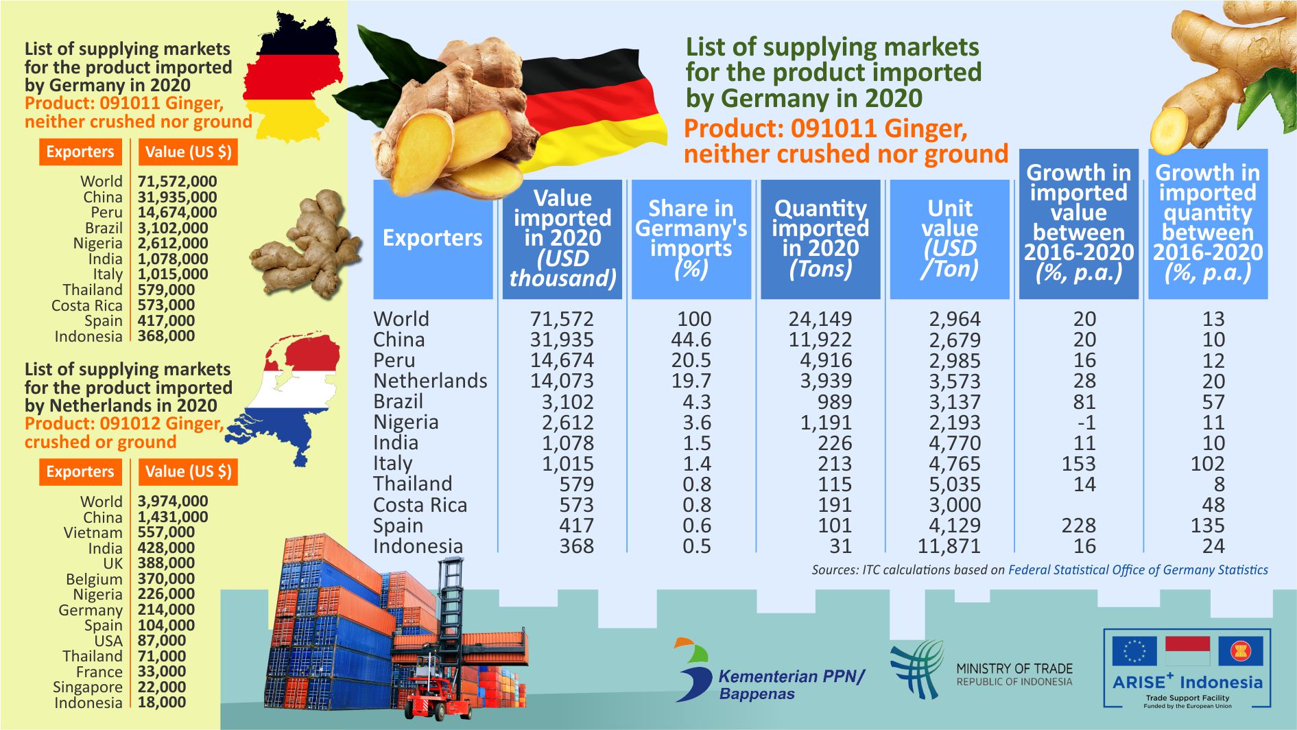 Market opportunities for ginger exports from Indonesia do exist. Demand for biopharmaceutical products is booming worldwide. According to ITC, the trade of oleoresins, the essential oil extracted from ginger, amounted to over US $ 833 million in 2020 while EU imports were over US $ 213 million (for detail trade statistic data on ginger, please see the infographics above). The potential of the EU market was highlighted by the Indonesian trade attaches in the Netherlands and Spain who receive frequent enquiries on ginger. Price competition is prominent in this market, with Indonesian exporters facing strong competition from producers from China, India, Peru and Brazil. Indonesian prices are relatively high because of the high logistics costs as Indonesian ports are less well situated on world shipping line routes compared with competitors from China and Brazil. Small enterprises of the sector also face the challenge of meeting certification requirements as is many other sectors.