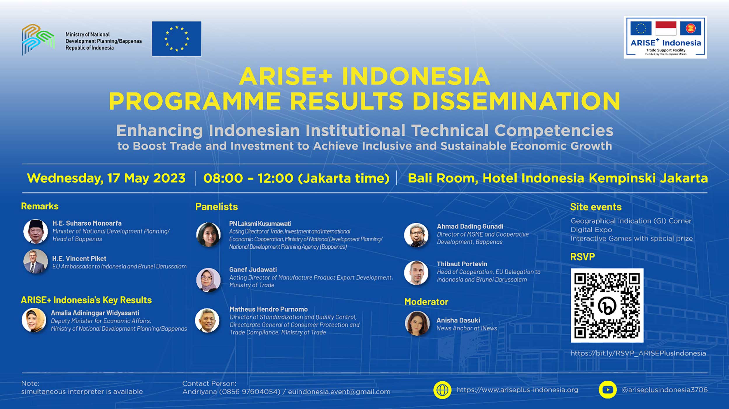 In addition to the main event, a Geographical Indication Corner will be set up to promote Indonesian GIs supported by ARISE+ Indonesia. A digital exhibition will also run alongside the event, showcasing the results, tools, and publications of each Priority Area.