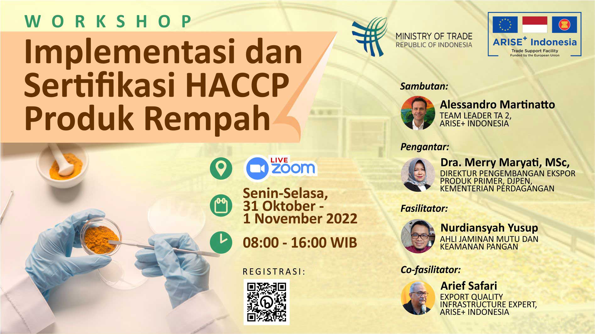 Following up on the results of the spices export sensitisation seminar held on 16 August 2022, the Ministry of Trade and the Ministry of Industry, in collaboration with ARISE+ Indonesia, organised the capacity-building workshop on HACCP (Hazard Analysis Critical Control Point) System Implementation & Certification.