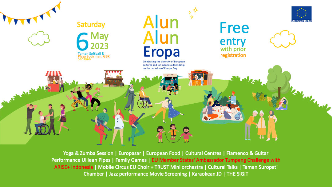 While Europe Day is celebrated on May 9th globally, in Indonesia, the public event, titled Alun-Alun Eropa, will take place on Saturday, May 6th, 2023, at Gelora Bung Karno, Senayan, Jakarta. Alun-Alun Eropa, an outdoor festival organised by the European Union Delegation to Indonesia, aims to celebrate the rich and diverse European culture and the people-to-people friendship between Europe and Indonesia.