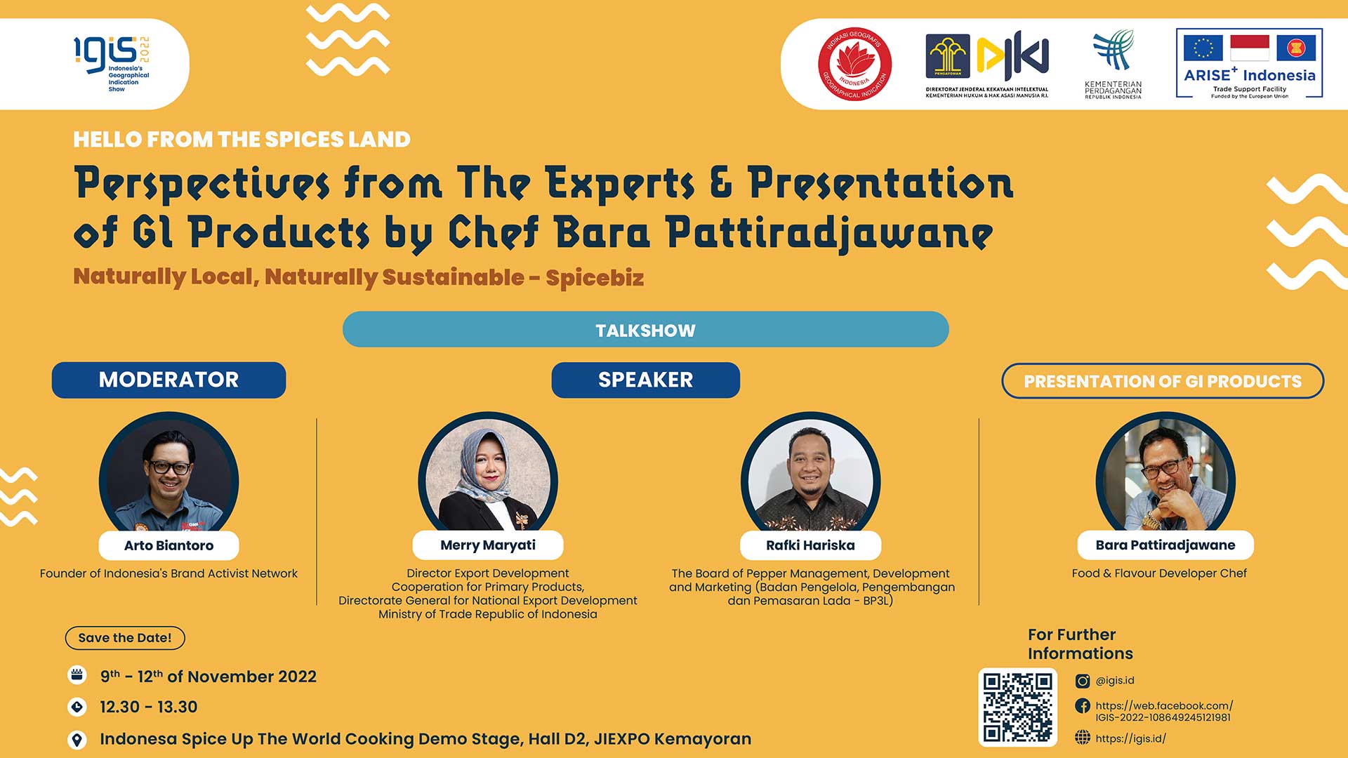 A Spicebiz talk show with the theme "Naturally Local, Naturally Sustainable", and a cooking show by food and flavour developer Chef Bara Pattiradjawane will enliven the Indonesian GIs showcase.